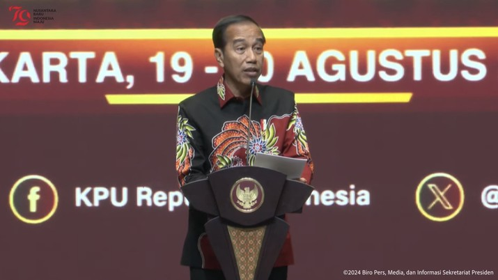 Presiden Joko Widodo (Jokowi) memberikan pengarahan pada Rapat Konsolidasi Nasional Kesiapan Pemilihan Kepala Daerah Serentak Tahun 2024 di Jakarta Convention Center, Jakarta, Selasa (20/8/2024). Pada kesempatan itu, Jokowi mengingatkan pentingnya kesiapan petugas jelang pilkada serentak nanti.